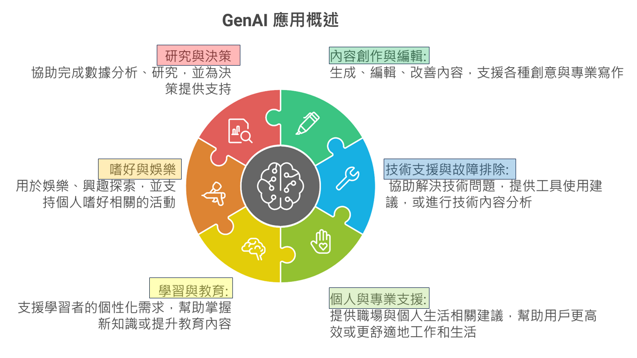 - 持續學習:透過生成式AI方便地學習新知識或技能,無論是語言、科技還是其他興趣愛好。